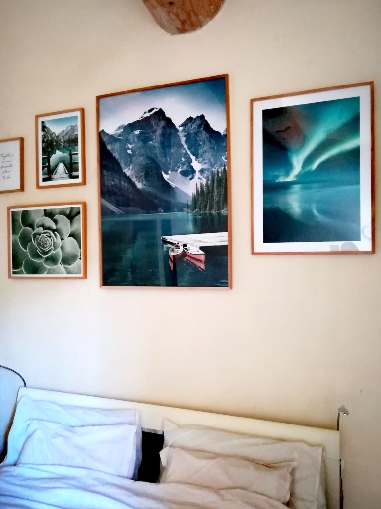 Voilà le résultat est là! Les cadres enfin positionnés au-dessus du lit (peut-être un peu trop hauts), mais le rendu est superbe! C’est exactement l’ambiance que je recherchais dans notre chambre! Nous aimons beaucoup les tons qui vont parfaitement avec une chaise ancienne que nous venons de rénover mais aussi avec notre édredon. Nos meubles de lit étant blancs, les tons bleu-vert ressortent énormément en entrant dans la chambre. Les paysages sont relaxants et le poster de l’aurore boréale invite à la rêverie…
