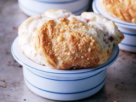 Menu 2 : Soufflé au jambon, brochette de rumsteck aux légumes et purée, fondant au chocolat