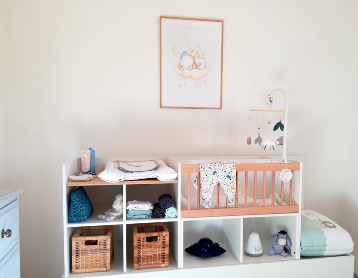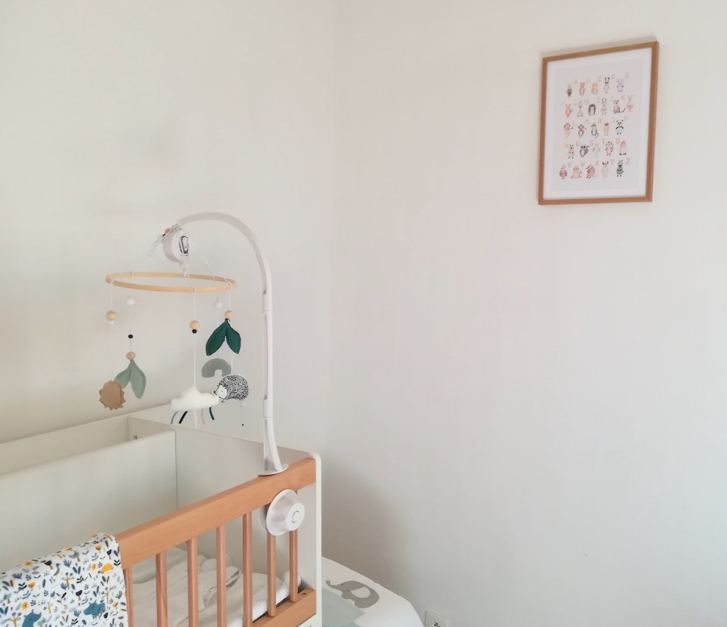 Nous avons commencé par repeindre la chambre afin que les murs soient sains et propres pour l’arrivée du bébé. Pour le coin lit, nous avons opté pour un lit combiné et évolutif : berceau, puis lit bébé et enfin lit enfant. Très pratique, il comprend le lit bébé, une table à langer mais aussi de nombreux rangements. Nous avons choisi un mobile composé de jouets en coton bio. Nous avons également choisi trois affiches de qualité afin d’amener un peu de décoration et de douceur à cette pièce.