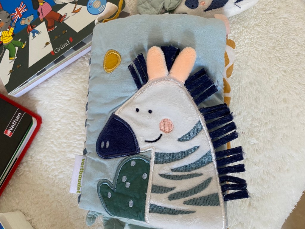 Notre petit bonhomme a déjà 7 mois et cela fait plusieurs mois qu’il prend plaisir à jouer avec ce livre en tissu. Acheté sur Verbaudet dès ses trois mois, nous l’avons au départ attaché à son transat afin qu’il puisse l’attraper et observer les contrastes. Peu à peu, il a découvert les différentes textures en velours, en tissu et d’autres surfaces plastifiées avec lesquelles il joue. Il a également commencé à attraper le petit panda et à le mettre à la bouche.