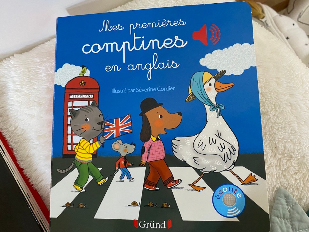 Je vous recommande également de choisir quelques livres sonores comme ici ceux de Gründ. Ayant vécu une dizaine d’années au Royaume-Uni, nous voulions trouver un petit livre en anglais. Celui-ci est très bien conçu. Cela permet à notre enfant d’apprendre les comptines anglaises. De plus, il peut facilement poser son doigt sur les petits cercles afin de lancer la chanson. La comptine est écrite sur la page en Anglais puis dessous en Français.